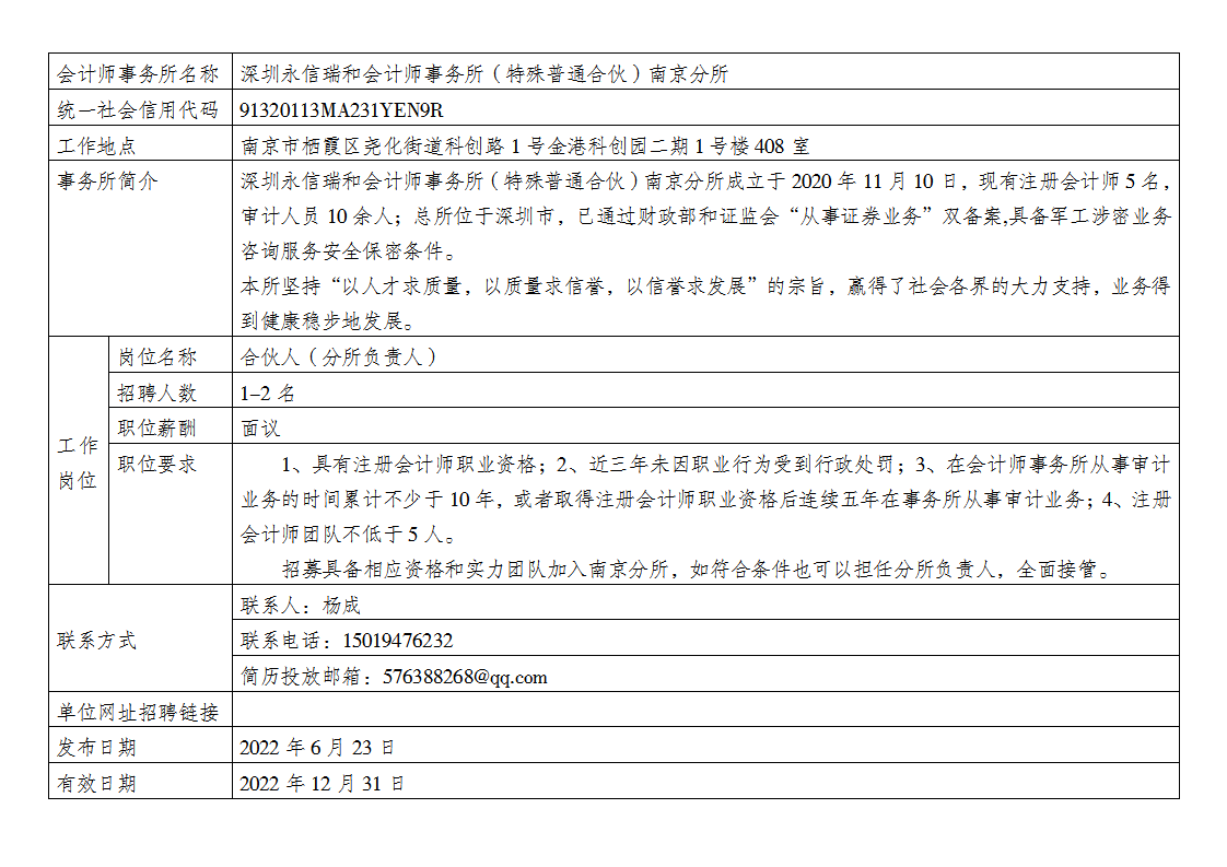 深圳永信瑞和会计师事务所南京分所招聘信息