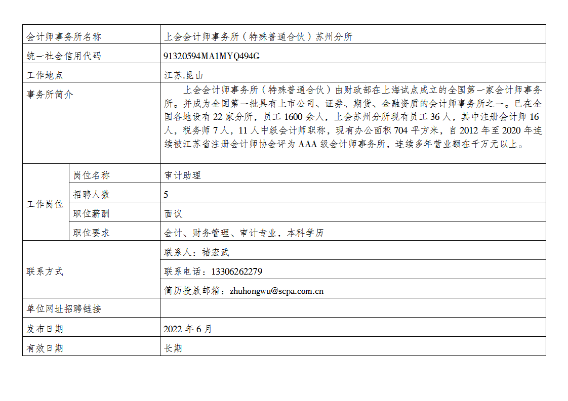 上会会计师事务所(特殊普通合伙)苏州分所招聘信息